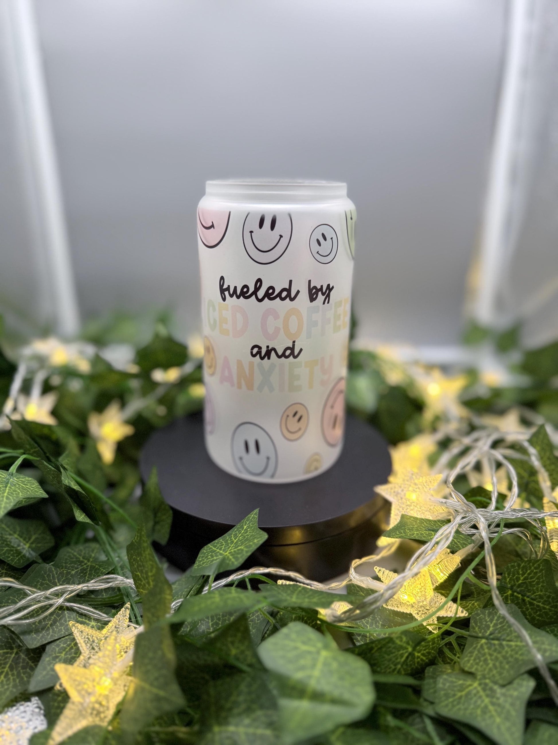 Fueled by Iced Coffee & Anxiety – 16oz Frosted Glass Cup with Bamboo Lid